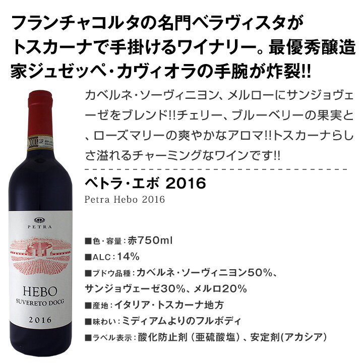 セット内容 赤750ml x 4本 1本目 マルティナ・ブルネッロ・ディ・モンタルチーノ 2012 Martina Brunello di Montalcino 2012 色・容量:赤750ml ALC:14% ブドウ品種:ブルネッロ(サンジョヴェーゼ・グロッソ)100% 産地:イタリア・トスカーナ地方・モンタルチーノ地区 味わい:フルボディ ラベル表示:酸化防止剤(亜硫酸塩) 2本目 ペトラ・エボ 2016 Petra Hebo 2016 色・容量:赤750ml ALC:14% ブドウ品種:カベルネ・ソーヴィニヨン50%、サンジョヴェーゼ30%、メルロ20% 産地:イタリア・トスカーナ地方 味わい:ミディアムよりのフルボディ ラベル表示:酸化防止剤(亜硫酸塩)安定剤(アカシア) 3本目 ウッジアーノ・キャンティ・リゼルヴァ・プレステージ 2013 Uggianoi Chanti Reserva Prestige 2013 色・容量:赤750ml ALC:13.5% ブドウ品種:サンジョヴェーゼ90%、カナイオーロ10% 産地:イタリア−トスカーナ地方 味わい:ミディアムよりのフルボディ ラベル表示:酸化防止剤(亜硫酸塩、ビタミンC)安定剤(アカシア) 4本目 バルバネーラ・シル・パッソ・トスカーナ・ロッソ 2016 Barbanera Sir Passo Toscana Rosso 2016 色・容量:赤750ml ALC:14% ブドウ品種:サンジョヴェーゼ100% 産地:イタリア−トスカーナ地方 味わい:ミディアムよりのフルボディ ラベル表示:酸化防止剤(亜硫酸塩) セット内容:赤750ml x 4本 ■1:マルティナ・ブルネッロ・ディ・モンタルチーノ 2012 ■2:ペトラ・エボ 2016 ■3:ウッジアーノ・キャンティ・リゼルヴァ・プレステージ 2013 ■4:バルバネーラ・シル・パッソ・トスカーナ・ロッソ 2016≪イタリアワインの王様ブルネッロ!!≫ 協会のヴィンテージ評価で最高5つ星の新着2012年に、 フランチャコルタの名門ベラヴィスタが トスカーナで産んだ極旨!! そして!!≪ジェームス・サックリング91点≫ いかにも上質のキャンティらしさが しっかりと感じらる激旨リゼルヴァに、 【ルカ・マローニで圧巻の98ポイント獲得!!】 アパッシメント(陰干しブドウ)醸造★