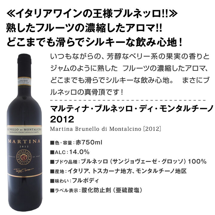 トスカーナの極旨ばかりを集めました!! 銘醸ブルネッロも入って、 この価格は絶対のお値打ちです!! 全国一律送料無料!! こちらのセットとあわせて当店内の他のワインを追加で お買い物いただいても送料が無料となります!! ※セットを複数ご注文の場合、セットごとの梱包ではございません。