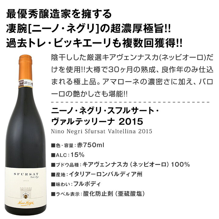 セット内容赤750ml x 5本 1本目 ニーノ・ネグリ・スフルサート・ヴァルテッリーナ 2015 Nino Negri Sfursat Valtellina 2015 色・容量:赤750ml ALC:15% ブドウ品種:キアヴェンナスカ(ネッビオーロ)100% 産地:イタリア−ロンバルディア州 味わい:フルボディ ラベル表示:酸化防止剤(亜硫酸塩) 2本目 アッポローニオ<ディヴォート>コペルティーノ・リゼルヴァ 2008 Apollonio Divoto Copertino Rosso Riserva 2008 色・容量:赤750ml ALC:14% ブドウ品種:ネグロアマーロ 70%、モンテプルチアーノ 30% 産地:イタリア−プーリア州 味わい:フルボディ ラベル表示:酸化防止剤(亜硫酸塩)、安定剤(アカシア) 3本目 トッレ・ヴァラーノ・アリアニコ・デル・タブルノ 2013 Torre Varano Aglianico del Taburno 2013 色・容量:赤750ml ALC:14% ブドウ品種:アリアニコ100% 産地:イタリア - カンパーニャ州 味わい:ミディアムよりのフルボディ ラベル表示:酸化防止剤(亜硫酸塩)、安定剤(アカシア) 4本目 カルーソ&ミニーニ・クタヤ・ネッロ・ダーヴォラ 2015 Caruso & Minini Cutaja Nero d'Avola 2015 色・容量:赤750ml ALC:14% ブドウ品種:ネッロ・ダーヴォラ100% 産地:イタリア・シチリア州 味わい:ミディアムよりのフルボディ ラベル表示:酸化防止剤(亜硫酸塩)、安定剤(アカシア) 5本目 ガランテ・ロマーニャ・サンジョヴェーゼ・アパッシメント 2016 Galante Romagna Sangiovese Appassimento 2016 色・容量:赤750ml ALC:14.5% ブドウ品種:サンジョヴェーゼ100% 産地:イタリア−エミリア・ロマーニャ州 味わい:フルボディ ラベル表示:酸化防止剤(亜硫酸塩) セット内容:赤750ml x 5本 ■1:ニーノ・ネグリ・スフルサート・ヴァルテッリーナ 2015 ■2:アッポローニオ<ディヴォート>コペルティーノ・リゼルヴァ 2008 ■3:トッレ・ヴァラーノ・アリアニコ・デル・タブルノ 2013 ■4:カルーソ&ミニーニ・クタヤ・ネッロ・ダーヴォラ 2015 ■5:ガランテ・ロマーニャ・サンジョヴェーゼ・アパッシメント 2016最優秀醸造家を擁するヴァルテリーナの 凄腕[ニーノ・ネグリ]が、陰干しした 厳選キアヴェンナスカ(ネッビオーロ)から仕込む濃厚極旨に、 ≪インターナショナル・ワインチャレンジ金賞!!≫ 当店最強[アッポローニオ]の トップキュヴェ[ディヴォート]の2008年!! そして!!""銘酒[タウラージ]を産む重要品種[アリアニコ]!! 【D.O.C.G】に昇格を果たした山岳地域タブルノ地区の極旨に、 数々のガイド誌で高評価連発★