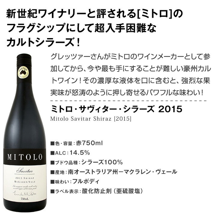 セット内容 赤750ml x 5本 1本目 グレッツァー・ビショップ 2016 Glaetzer Bishop Shiraz Barossa Valley [2016] 色・容量:赤750ml ALC:15.0% ブドウ品種:シラーズ100% 産地:南オーストラリア州−バロッサ・ヴァレー 味わい:フルボディ ラベル表示:酸化防止剤(亜硫酸塩) 2本目 ミトロ・サヴィター・シラーズ 2015 Mitolo Savitar Shiraz [2015] 色・容量:赤750ml ALC:14.5% ブドウ品種:シラーズ100% 産地:南オーストラリア州−マクラレン・ヴェール 味わい:フルボディ ラベル表示:酸化防止剤(亜硫酸塩) 3本目 ミトロ・G.A.M・シラーズ 2015 Mitolo G.A.M. Shiraz 2015 色・容量:赤750ml ALC:14.5% ブドウ品種:シラーズ100% 産地:南オーストラリア州−マクラレン・ヴェール 味わい:フルボディ ラベル表示:酸化防止剤(亜硫酸塩) 4本目 ハートランド・スポサ・エ・スポサ(ドルチェット・ラグレイン) 2014 HEARTLAND Sposa e Sposa Dolcetto Lagrein 2014 色・容量:赤750ml ALC:14.5% ブドウ品種:ドルチェット、ラグレイン 産地:オーストラリア、南オーストラリア州、ラングホーン・クリーク 味わい:フルボディ ラベル表示:酸化防止剤(亜硫酸塩) 5本目 ハートランド・シラーズ 2015 Heartland Shiraz 2015 色・容量:赤750ml ALC:14.5% ブドウ品種:シラーズ100% 産地:オーストラリア、南オーストラリア州、ラングホーン・クリーク 味わい:フルボディ ラベル表示:酸化防止剤(亜硫酸塩) セット内容:赤750ml x 5本 ■1:グレッツァー・ビショップ 2016 ■2:ミトロ・サヴィター・シラーズ 2015 ■3:ミトロ・G.A.M・シラーズ 2015 ■4:ハートランド・スポサ・エ・スポサ(ドルチェット・ラグレイン) 2014 ■5:ハートランド・シラーズ 2015天才醸造家ベン・グレッツァーが手掛ける超濃厚パワフル5本セット! パーカーさんがベタ惚れする 超怪物カルト[グレッツァー]も! 伝説の[アモンラ]の双璧にして天才が手掛ける もう一つのフラグシップ[ミトロ]も! グレッツァーが新たに立ち上げた 新ブランド[ハートランド]も! 現地オーストラリアそして全米でも入手困難な ワインばかりのベン・グレッツァー5本セット! 毎年とんでもないパーカーポイントを獲得するオーストラリアのカルト! 『バロッサ・ヴァレー地区特有の威厳と高密度、さらにリッチな滑らかさを加えたアモンラ!! これはニューヨークで一本1500ドル(約165,000円)というプレミア付き価格で取引されている!!』と プレミアムワイン専門誌ワイナートで紹介されている幻のワイン!!それが今アメリカに衝撃を走らせている 話題の怪物カルトワイン【グレッツァー・アモンラ】です!! 大・大・大反響!! 2007年ヴィンテージ、2009年ヴィンテージ、2010年ヴィンテージと、 楽天週間ランキング セット・4本セットで第1位を獲得しました!! 全国一律送料無料!! こちらのセットとあわせて当店内の他のワインを追加で お買い物いただいても送料が無料となります!! ※セットを複数ご注文の場合、セットごとの梱包ではございません。